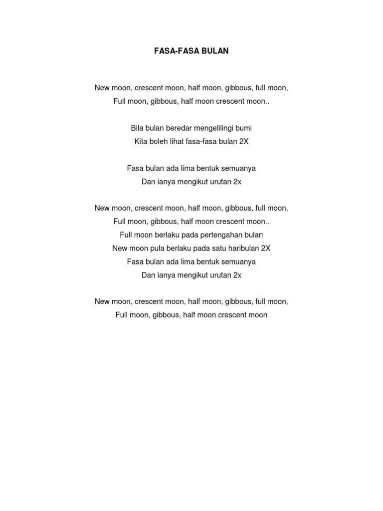 Lagu Fasan Bulan untuk digunakan dalam mata pelajaran Sains. Lagu Fasa Bulan Bulan bersinar terang Pada waktu malam Sungguh indah bercahaya Menerangi alam Ia tetap beredar Mengelilingi bumi Itulah tanda Kebesaran Ilahi Bulan Berbentuk sfera Dan Nampak berseri Cahaya Berpunca daripada Matahari Dari anak bulan menjadi Bulan Sabit Dan Bulan Purnama itulah Bulan Penuh. Entri kali ini Momi nak kongsi kepada anda sebuah lagu dari Hazama bersama Tuju yang berjudul FASA.